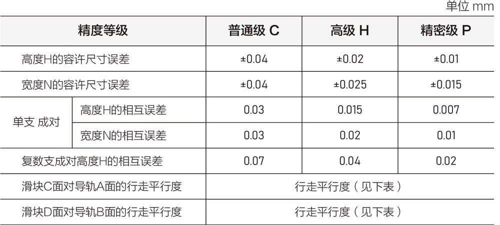 滑块C面对导轨A面、滑块D面对导轨B面的行走平行度与导轨精度、长度有关,其值列于下表。