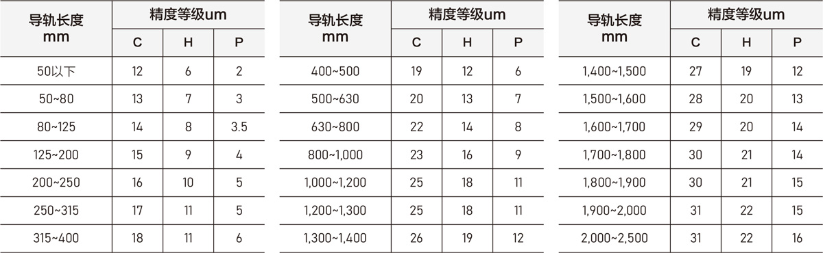 与非互换性直线导轨的精度对比,互换性直线导轨的精度在复数支导轨上其成对高度精度及宽度精度要稍显逊色,而行走平行精度则与非互换性直线导轨一致。