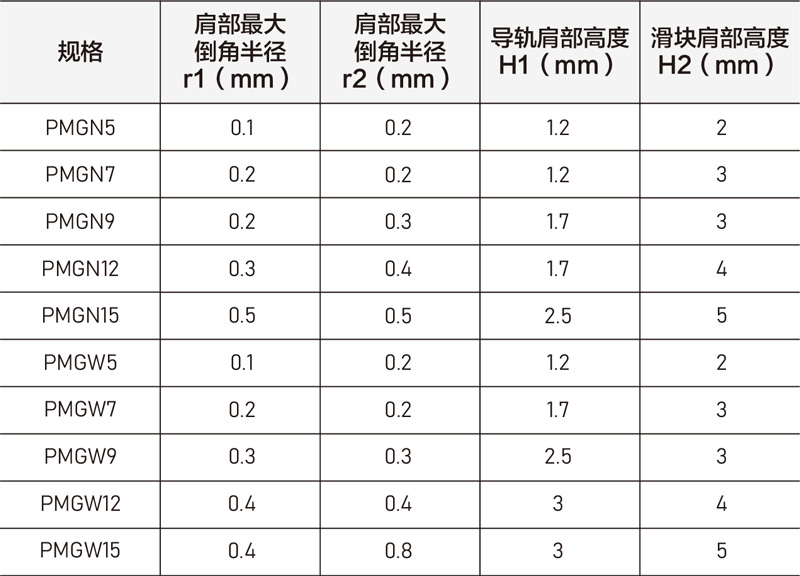 注:上述数值适用于ZF/Z0之预压等级,若使用Z1等级或使用两支以上的导轨(含两支),建议使用上述数值之50%以下。